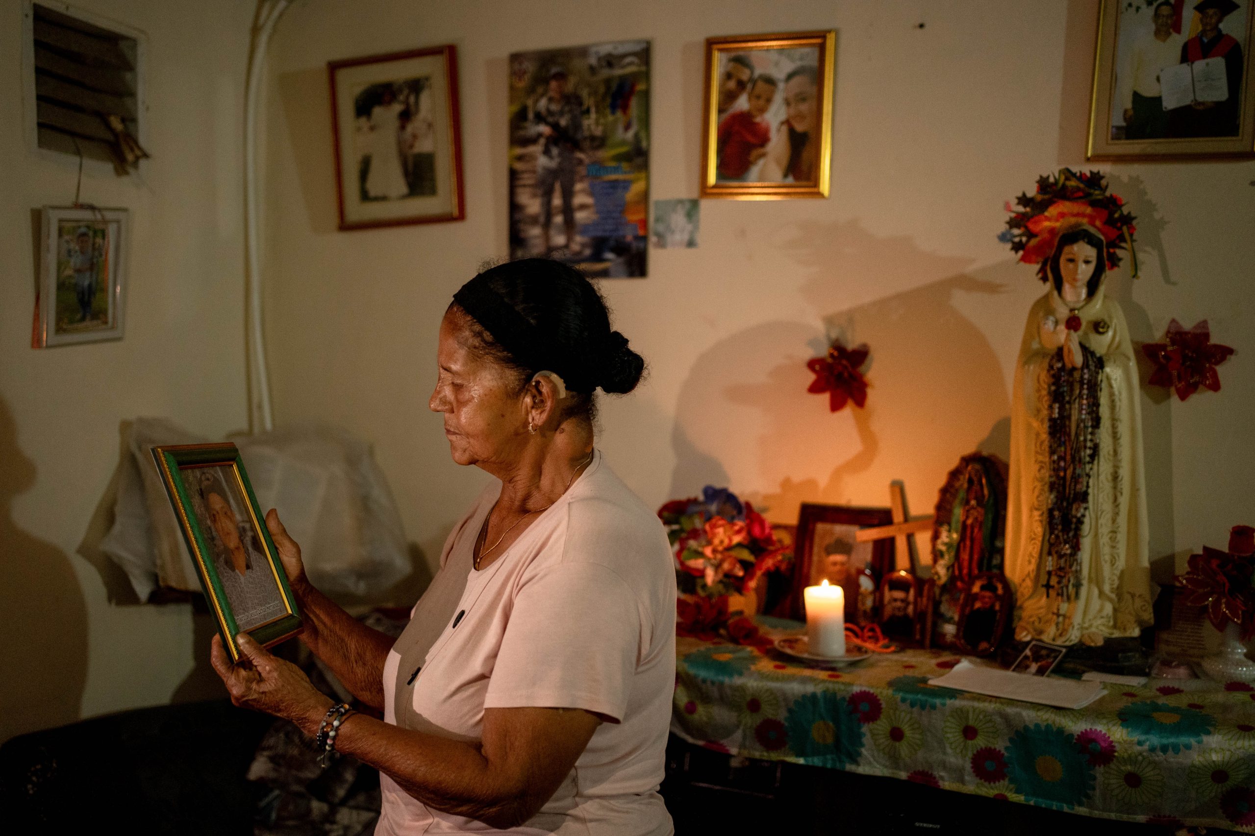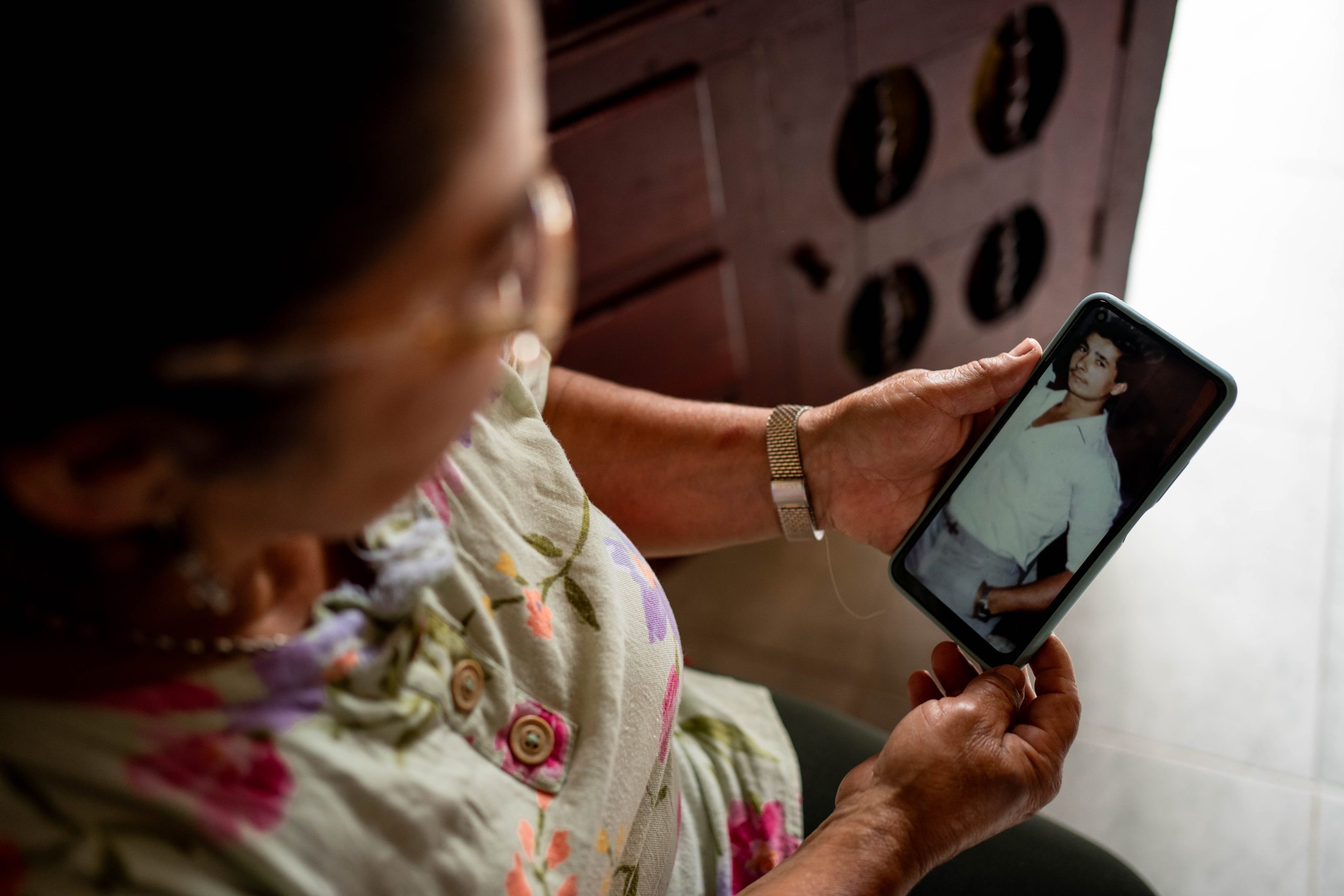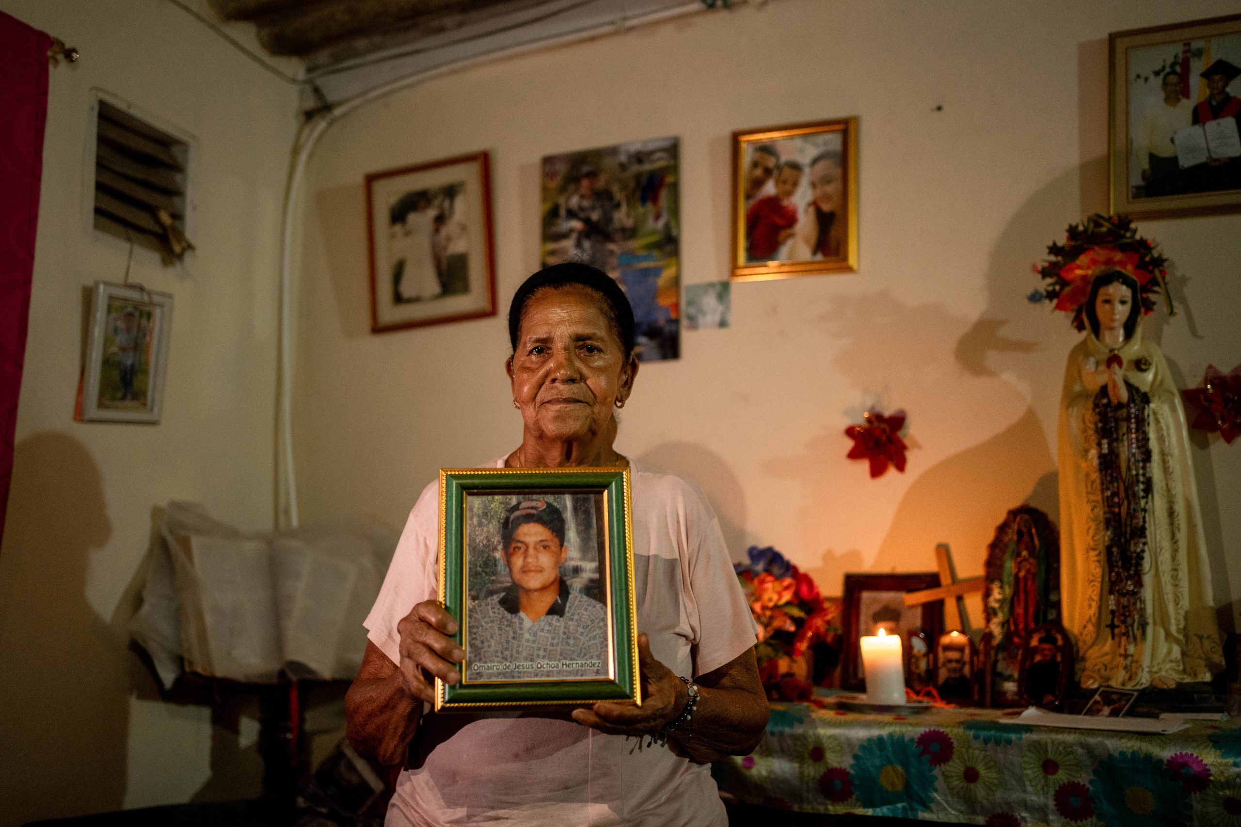 “Yo nací y me crié en las veredas Tapón y San Julián. Me vine al pueblo con mis cuatro hijos y trabajé lavando ropa, en casas de familia. A mi hija me la desaparecieron en el 98. A Jaime Alberto, mi hijo mayor, me lo mataron en el 2001, después me dijeron que eso hacía parte de esos falsos positivos. Y al otro en el 2005. Yo guardo fotos, ropa, objetos, cadenas… voy a poner todas las fotos en un cuadro grande para no estar guardando. Llegué a la Asociación de Víctimas, porque soy víctima y ahí me quedé”.