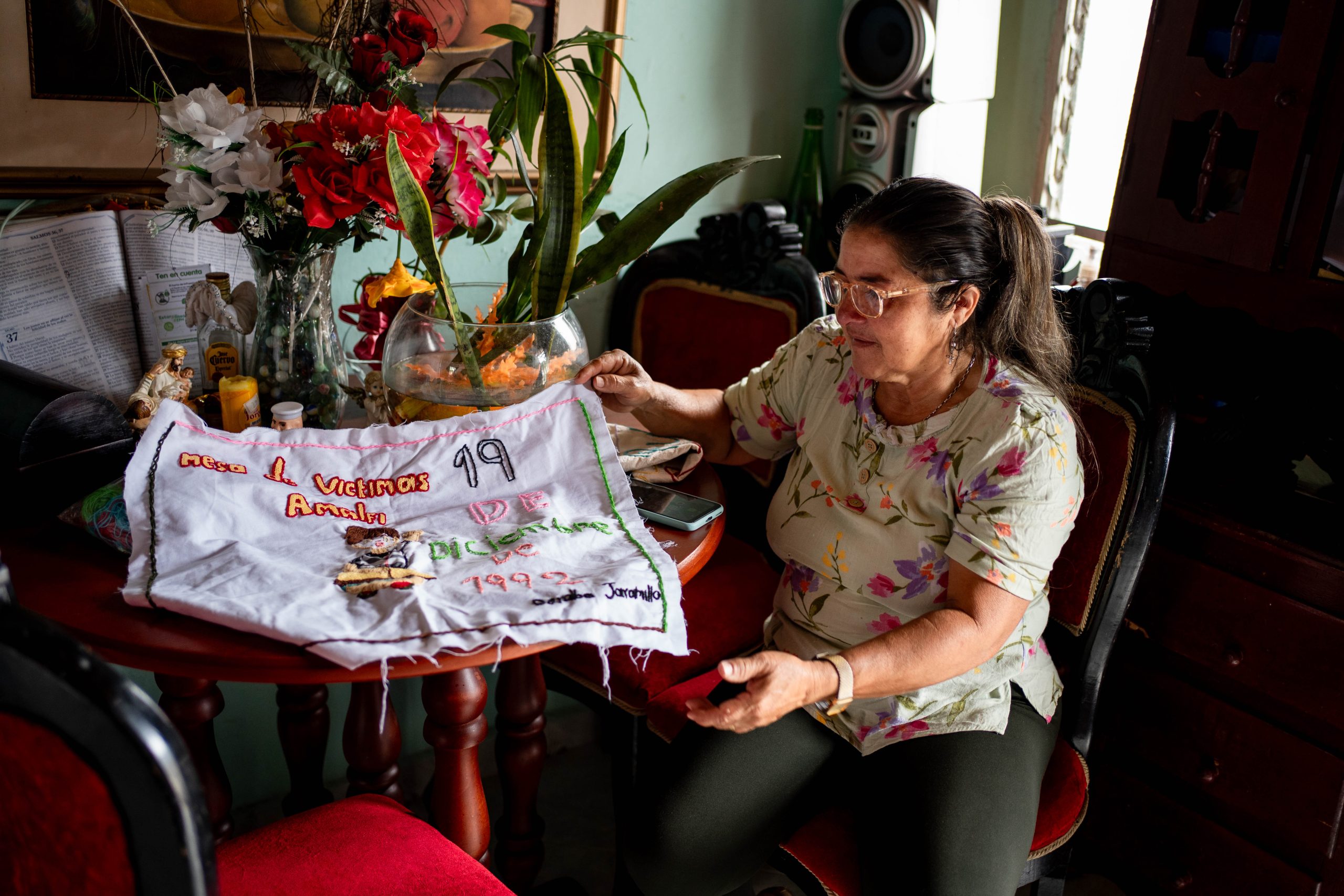 En Amalfi, la memoria se construye paso a paso, como quien cose, borda o guarda un objeto querido en una caja para que no se pierda. En la Asociación de Víctimas de Amalfi, habitantes del municipio y de veredas cercanas se encuentran para hablar de lo vivido: desplazamientos, ausencias, duelos, amenazas, silencios impuestos por el miedo y también cuidados que sostuvieron a sus familias en medio del conflicto. Son historias marcadas por el tránsito entre el campo y el pueblo, por los retornos obligados y las partidas repentinas; por hijos que crecieron entre montañas, minas y ciudades; por padres y hermanos que no volvieron; y por objetos que acompañaron el recorrido —una colcha en construcción, un altar heredado, un peluche que cruzó territorios— como formas sencillas y profundas de conservar lo que importa. Estos espacios comunitarios se han vuelto lugares para escucharse, reconocer lo que cada una trae y tejer las memorias de Amalfi desde la vida cotidiana, sin monumentos ni discursos oficiales. Aquí, la memoria va más allá del recuerdo de la guerra, está en el gesto de cuidar, de reunirse y de acompañar.