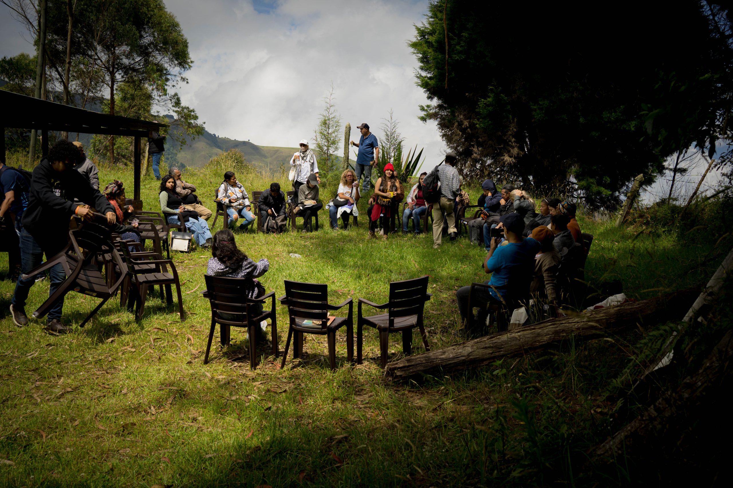 Uno de los momentos más significativos ocurrió en Palmitas. Allí, firmantes de paz y comunidad compartieron un espacio que profundizó la dimensión restaurativa. Calvin, firmante de paz, explicó la historia y el valor del predio: “El uso del suelo es forestal protector, es un techo de Medellín y es rico en una cuestión hídrica. No es una tierra para sembrar y eso fue un baldado de agua fría porque pensábamos que aquí podríamos hacer nuestros proyectos productivos. En un ejercicio de aprendizaje e investigación conocimos el uso del suelo. La UdeA nos ha apoyado. Empezamos a tomar consciencia de que esto es muy importante para nuestro trabajo social y el medio ambiente para el mundo”.